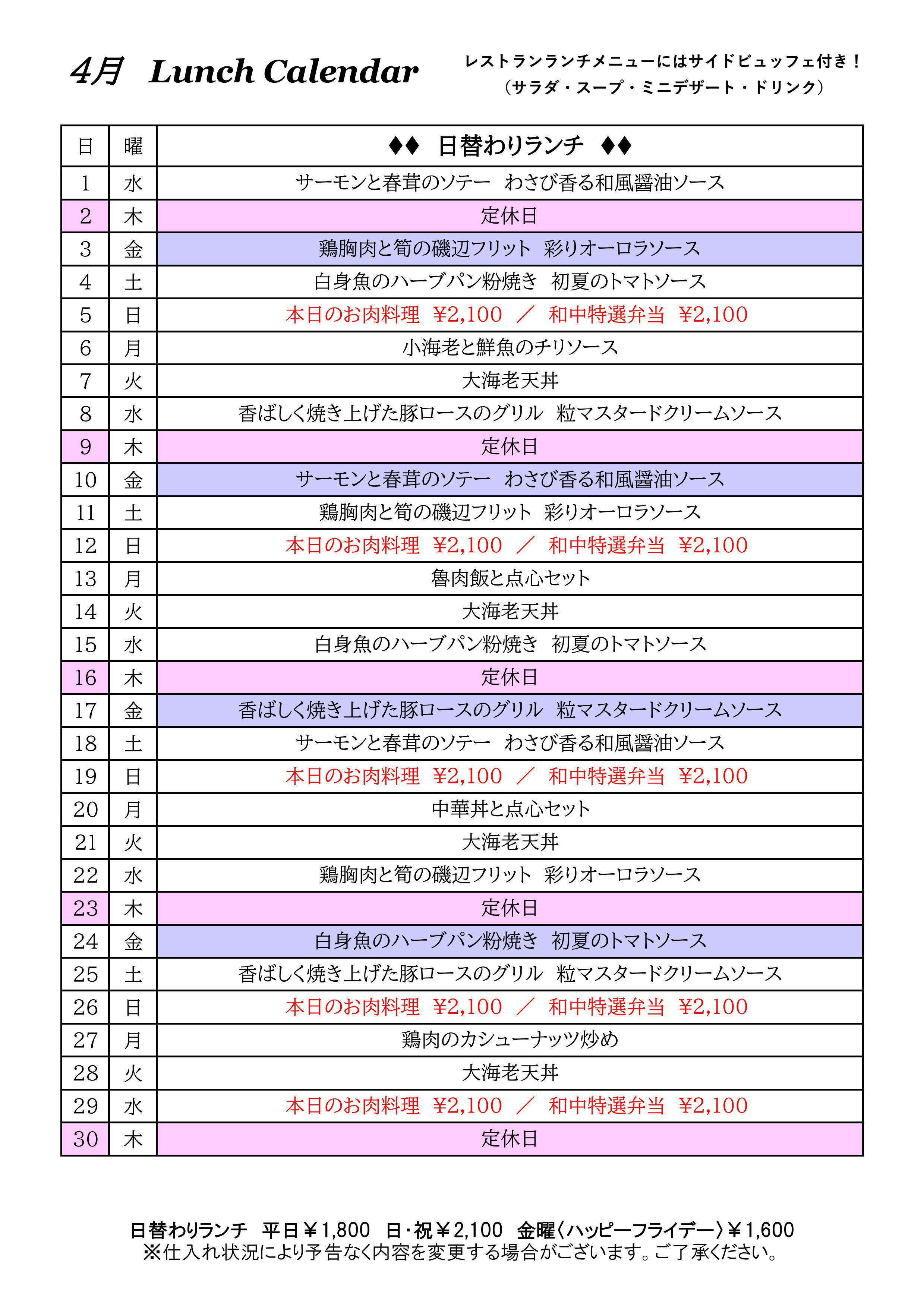 Business hours | ■Breakfast breakfast is not open ■Lunch Monday - Friday, 11: 30-15: 00 (Last Order 14: 00) Saturday·Sunday·Congratulation, 11: 30-15: 30 (Last Order 14: 30) ※Closed for lunch:Thursday ■Dinner 17:00 to 21:00(Last order 20:00) ※Dinner closed:Tuesday,Thursday |