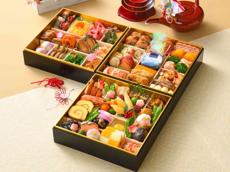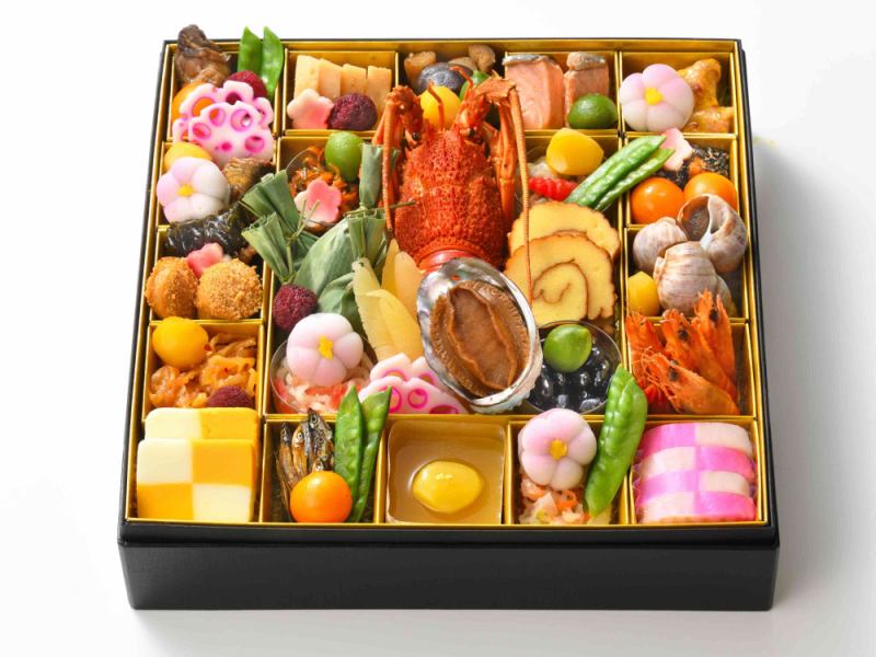 龙虾、清酒蒸鲍鱼、鲱鱼籽、松前腌鱿鱼、竹筒茶布、红白腌菜